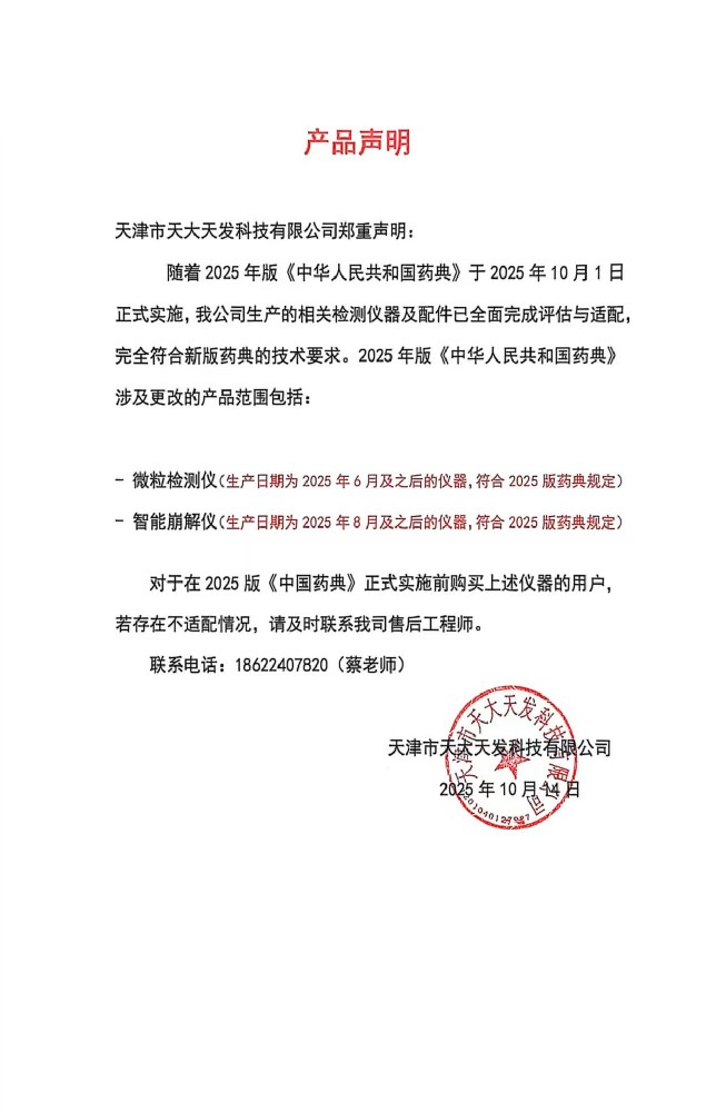 | 尊敬的各界朋友們: 歡迎您進(jìn)入天津市天大天發(fā)科技有限公司的網(wǎng)站進(jìn)行瀏覽,首先感謝各界朋友多年來對天大天發(fā)藥品檢測儀器和分析儀器的關(guān)心與支持! 天津市天大天發(fā)科技有限公司是通過ISO9001質(zhì)量管理體系認(rèn)證、ISO14001環(huán)境管理體系的認(rèn)證的高新技術(shù)企業(yè),是專業(yè)的藥檢儀器和分析儀器的制造廠商。 我們的產(chǎn)品包括藥品溶出儀系列、微粒檢測儀系列、內(nèi)毒素檢查儀系列等40余種產(chǎn)品,主要產(chǎn)品覆蓋了全國所有省區(qū),部分產(chǎn)品已進(jìn)入海外市場。公司在藥檢領(lǐng)域樹立了良好的品牌形象,贏得了廣大用戶的贊譽。 公司將更好地適應(yīng)瞬息萬變的市場,增強企業(yè)的核心競爭力。抓住全球經(jīng)濟飛速發(fā)展的歷史性機遇,以創(chuàng)新精神進(jìn)行新的創(chuàng)業(yè)。以高起點、高速度、高效率創(chuàng)造出中國藥品檢測儀器和分析儀器領(lǐng)域中的品牌形象,立足中國,走向國際。 我們熱切希望您成為天大天發(fā)科技有限公司的合作伙伴! |